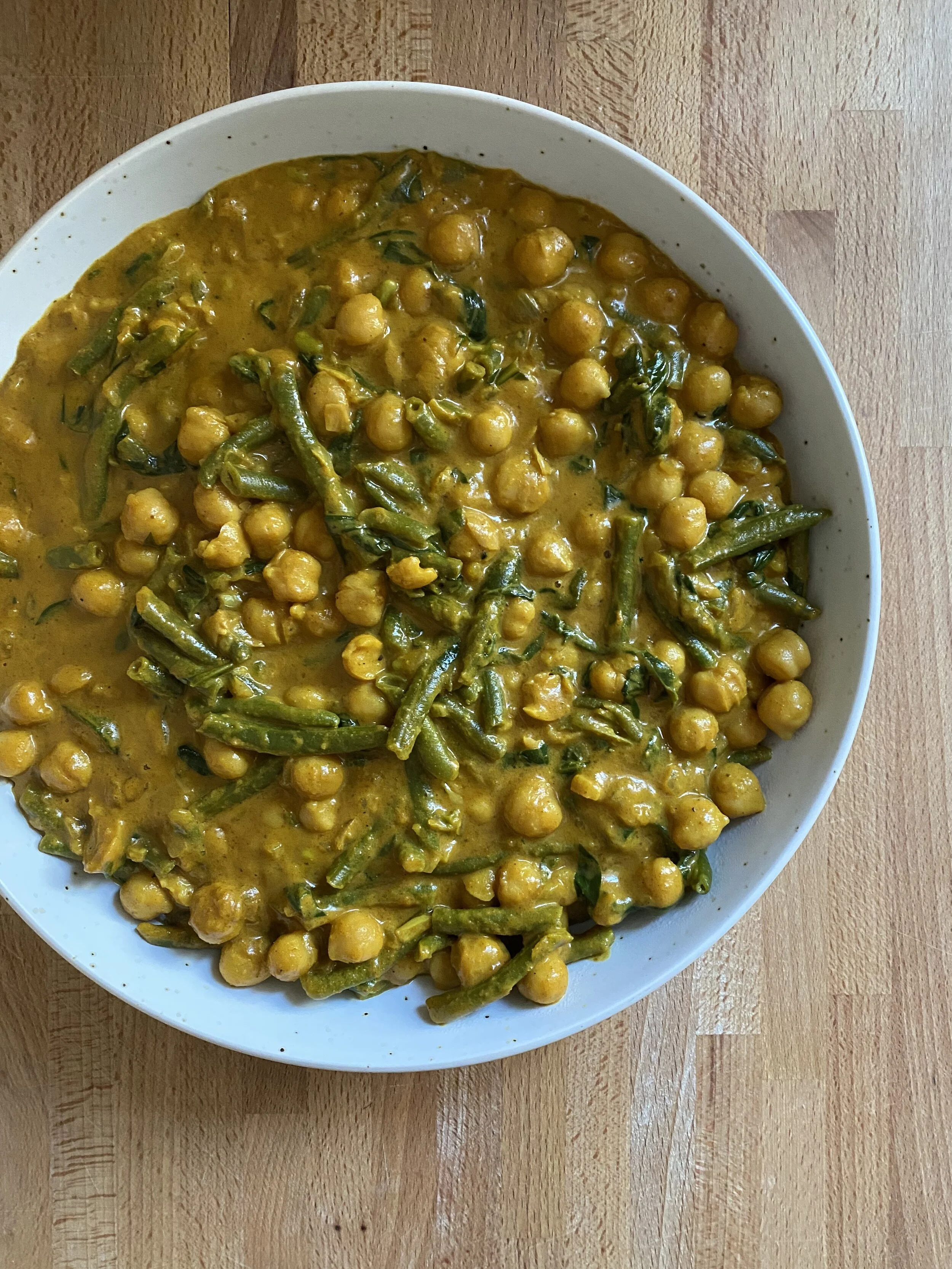 At this stage I make sure to taste and adjust Salt content & seasonings as the water content of Spinach and Green Beans can dilute the flavors.