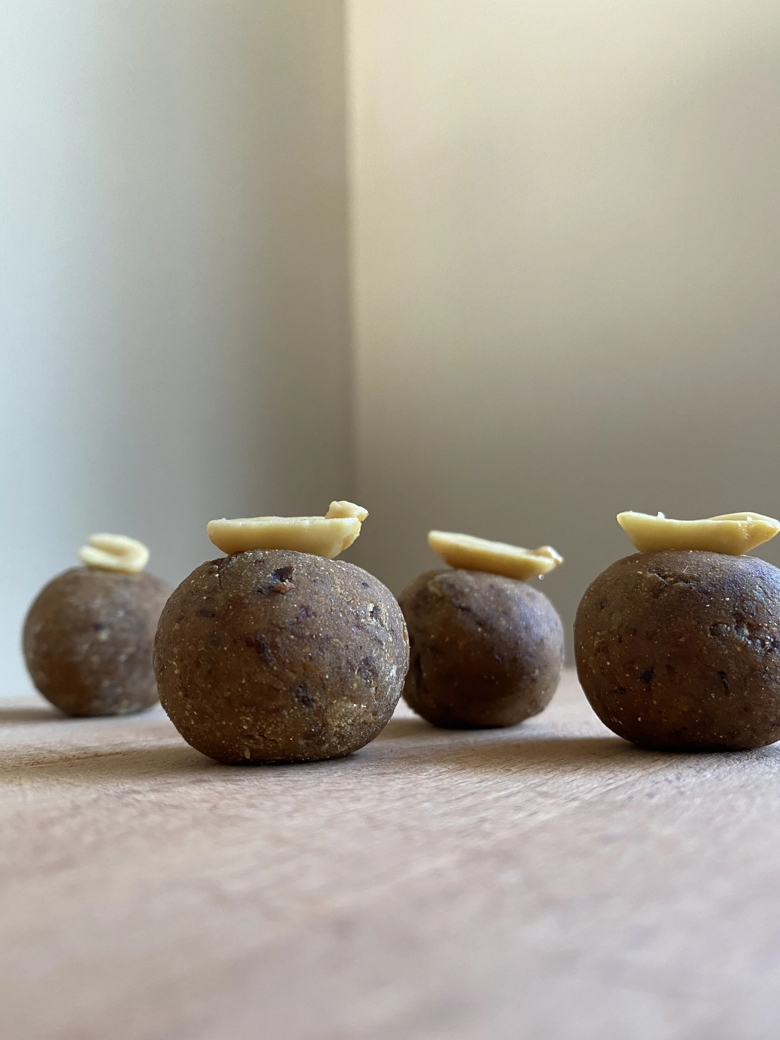 Once you have achieved the desired consistency, use a melon baller to portion out your balls & shape into little spheres. Garnish with a half peanut if you’d like & enjoy immediately or store for a small snack throughout the week.