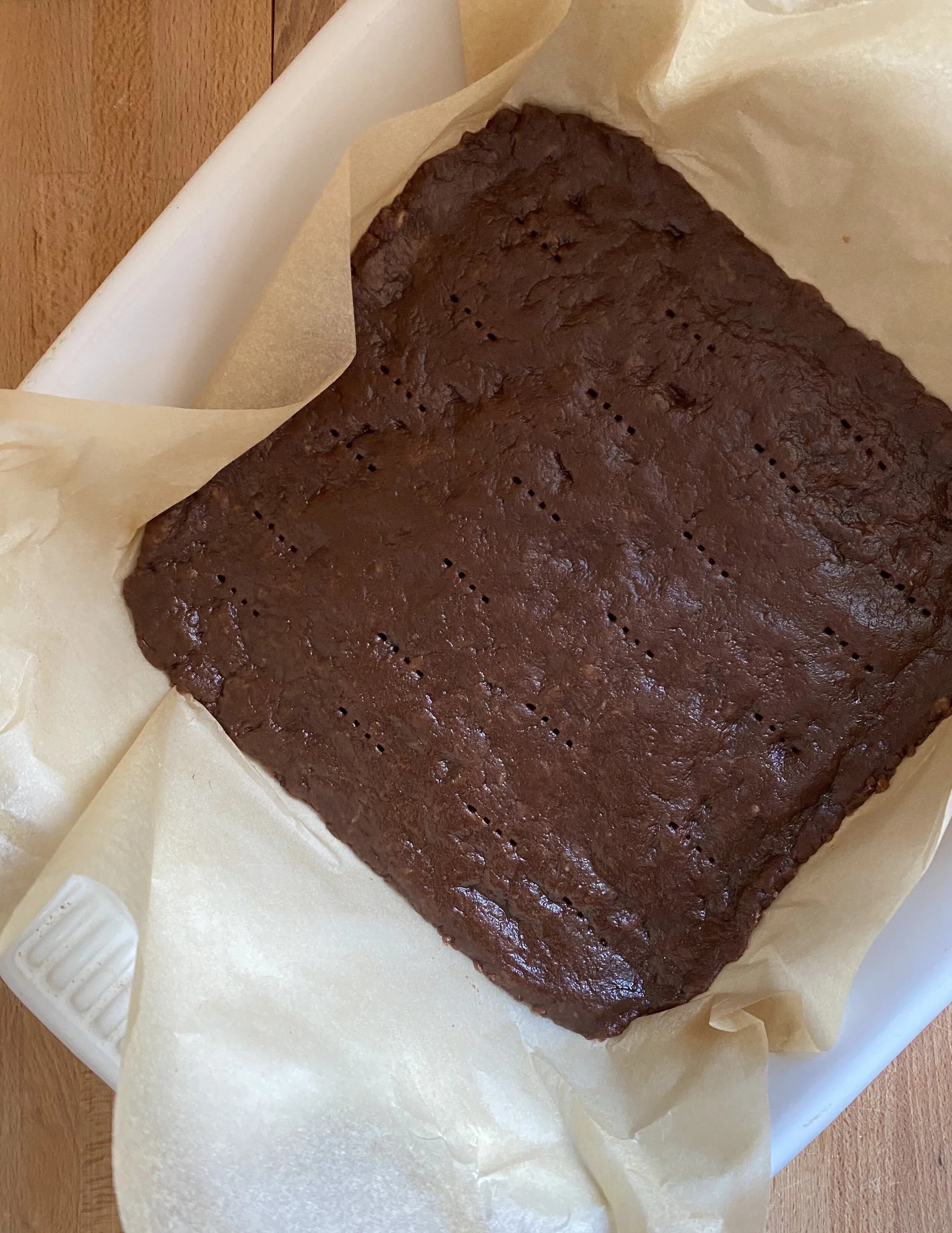 Place dough in a 9”x9” baking pan lined with parchment paper. Flatten the mixture so it is about 1/4” high. Allow to chill in the refrigerator for about 10-15 minutes.