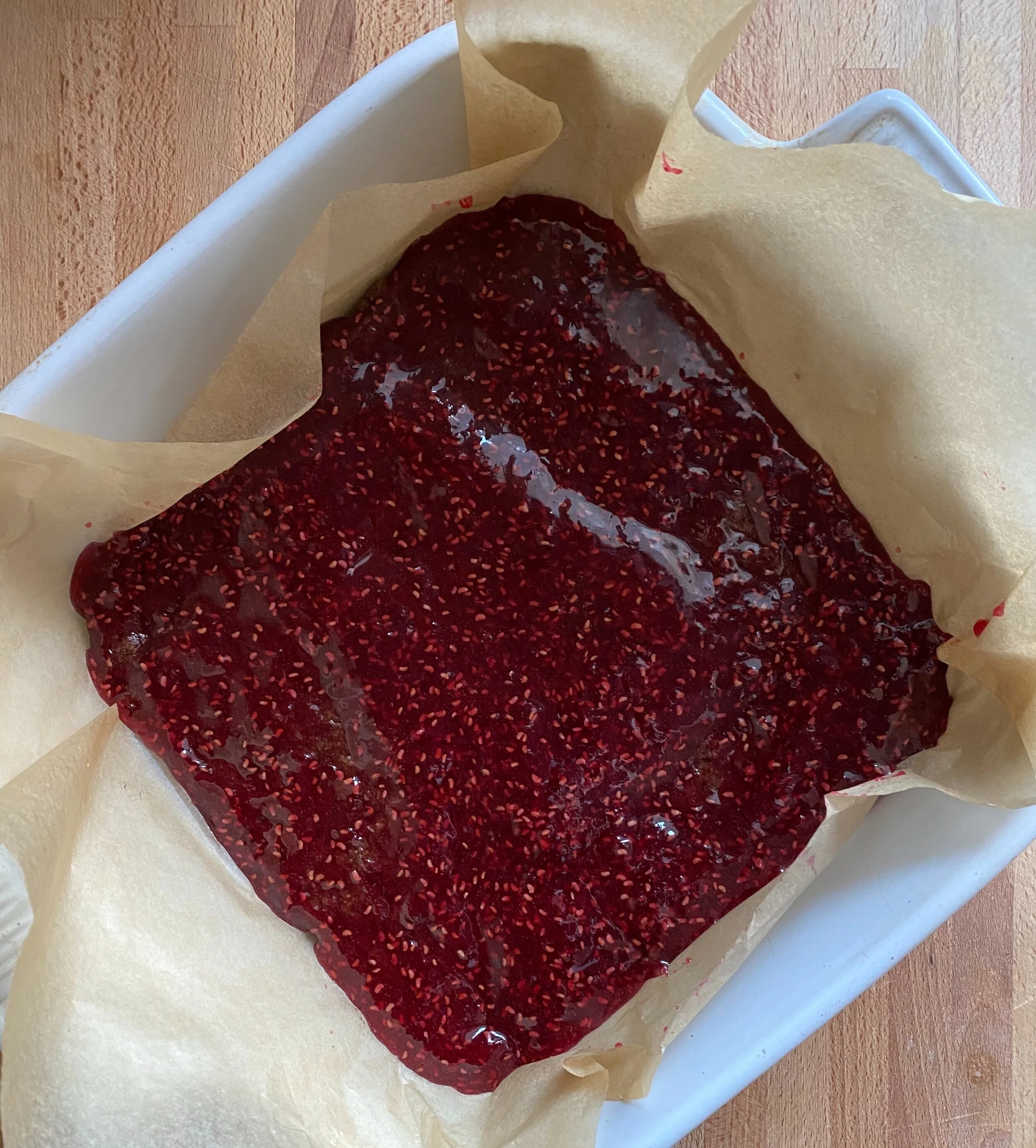 Sprinkle the crumble to cover the Raspberry Jam fully.
