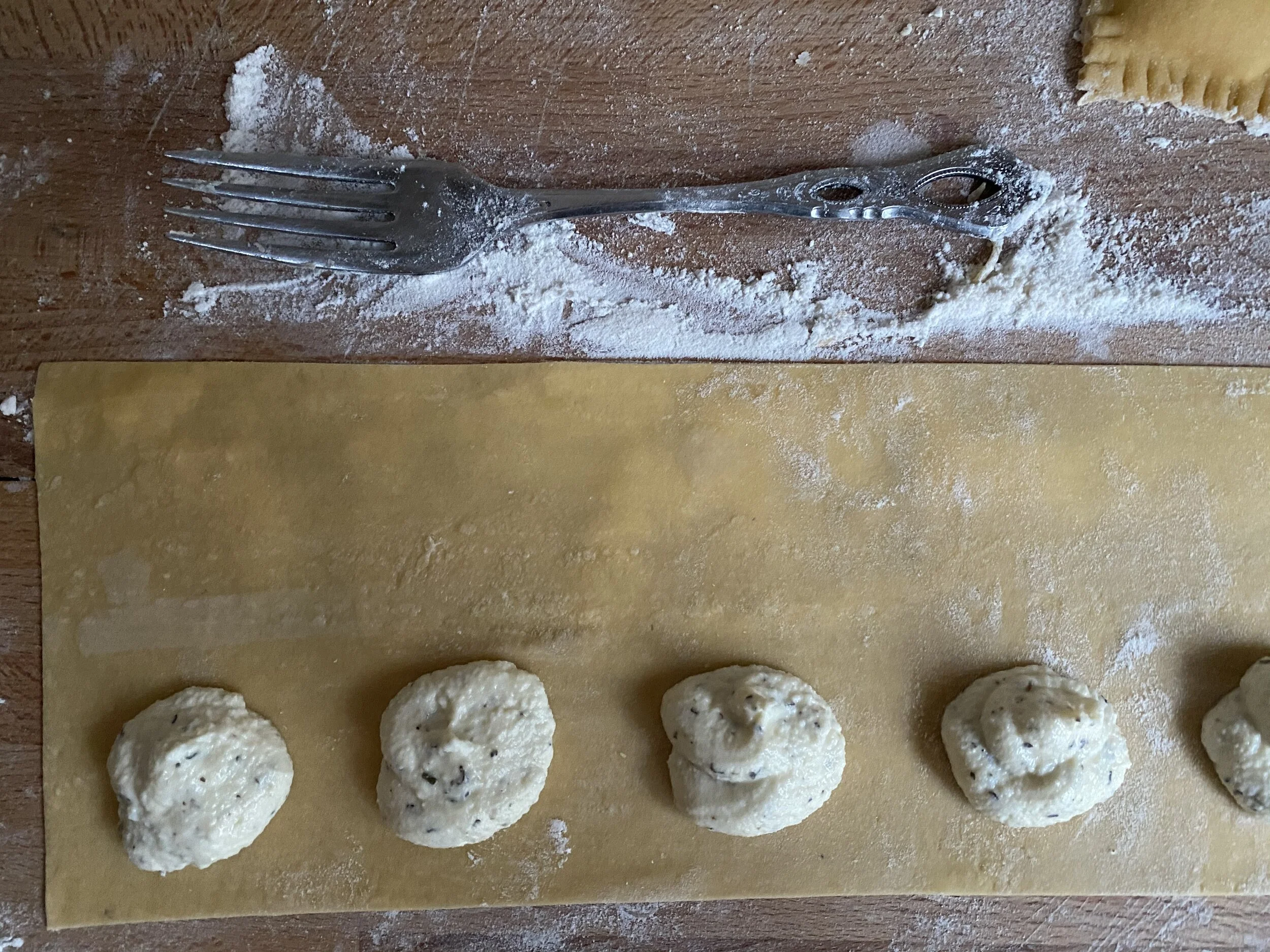 Once you are ready to assemble, pipe 1.5” diameter dollops of filling onto a rectangular sheet of pasta that is about 2.5-3” wide by the length of your surface (or as much pasta as you have). Dollops should be places about 1/2” apart & about 1/4” from the base (long side) of your pasta sheet.